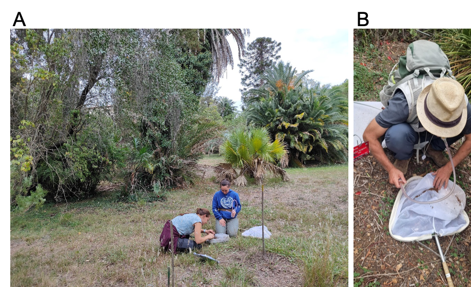 Les insectes sont ensuite collectés avec un aspirateur buccal (Figure ci-dessous B) puis conservés dans la Collection Continentale d’Arthropodes INRAE-CBGP, Centre de Biologie pour la Gestion des Populations (Montpellier, France) : https://doi.org/10.15454/D6XAKL. Les identifications sont réalisées par Jean-Claude Streito.